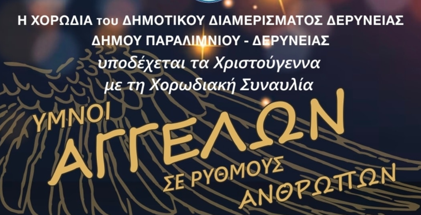 Η ΧΟΡΩΔΙΑ του ΔΗΜΟΤΙΚΟΥ ΔΙΑΜΕΡΙΣΜΑΤΟΣ ΔΕΡΥΝΕΙΑΣ ΔΗΜΟΥ ΠΑΡΑΛΙΜΝΙΟΥ – ΔΕΡΥΝΕΙΑΣ υποδέχεται τα Χριστούγεννα με τη Χορωδιακή Συναυλία Ύμνοι Αγγέλων σε ρυθμούς ανθρώπων» την Κυριακή 21 Δεκεμβρίου 2025 και η ώρα 18:30 στον Ιερό Ναός Αγίων Πάντων, Δερύνεια