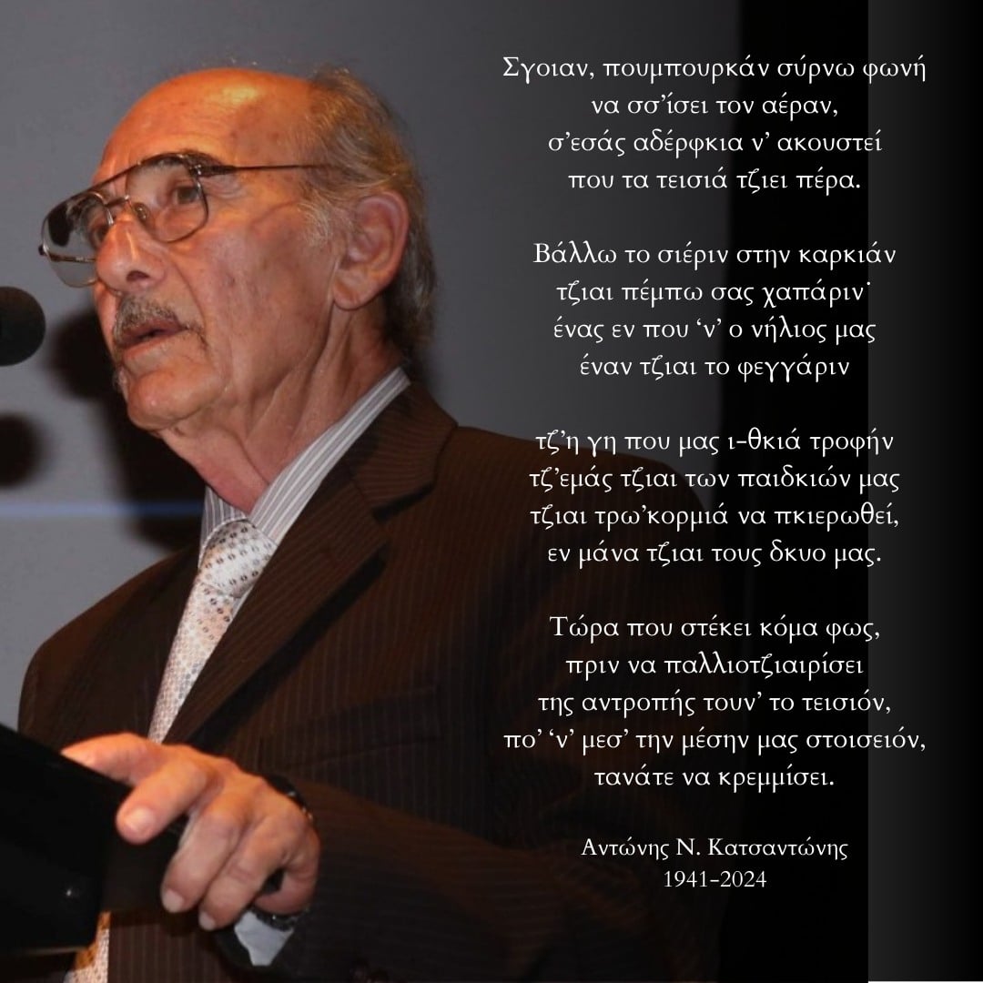 Ο λαϊκός ποιητής και Πρόεδρος του Παγκύπριου Ομίλου Λαϊκών Ποιητών και Φίλων της Ποίησης, Αντώνης Κατσαντώνης, απεβίωσε το πρωί της Τετάρτης σε ηλικία 82 ετών, στο Νοσοκομείο Παραλιμνίου, όπου νοσηλευόταν τις τελευταίες μέρες.