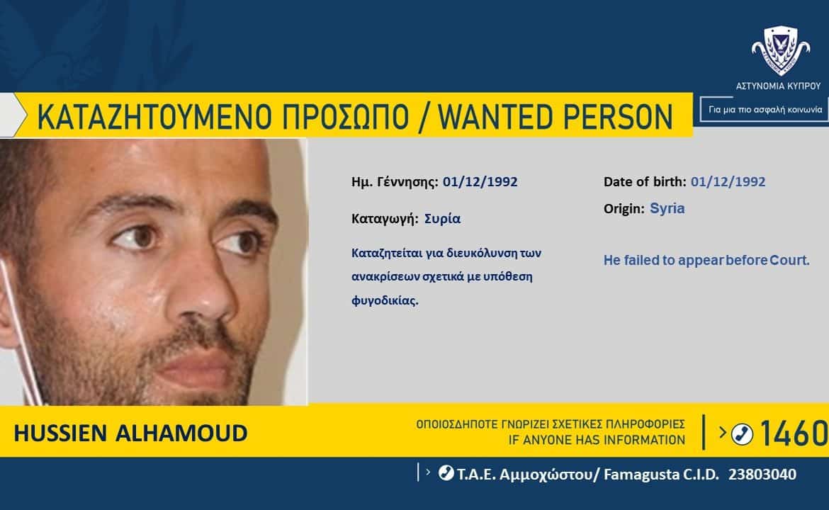 Η Αστυνομία καταζητεί τον HUSSIEN ALHAMOUD, 30 χρόνων από τη Συρία, φωτογραφία του οποίου δημοσιεύεται, σε σχέση με διερευνώμενη υπόθεση φυγοδικίας. Ο 30χρονος παρέλειψε να παρουσιαστεί ενώπιον του Κακουργιοδικείου Αμμοχώστου, στις 08/11/2022, όπου ήταν ορισμένη υπόθεση εναντίον του.