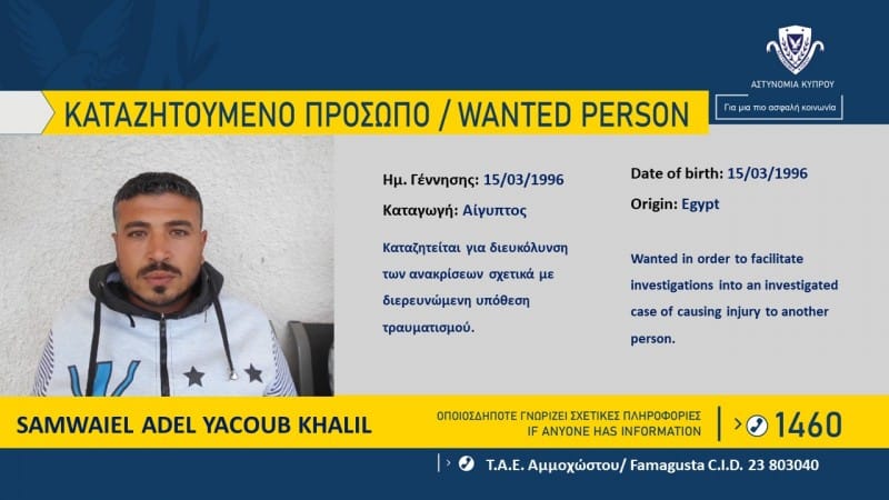 Η Αστυνομία, ζητά πληροφορίες που μπορούν να βοηθήσουν στον εντοπισμό του SAMWAIEL ADEL YACOUB KHALIL, 26 ετών, από την Αίγυπτο, εναντίον του οποίου εκκρεμεί δικαστικό ένταλμα σύλληψης, για διευκόλυνση των ανακρίσεων, σχετικά με διερευνώμενη υπόθεση τραυματισμού, που διαπράχθηκε στην επαρχία Αμμοχώστου, στις 11 Ιουνίου 2022.