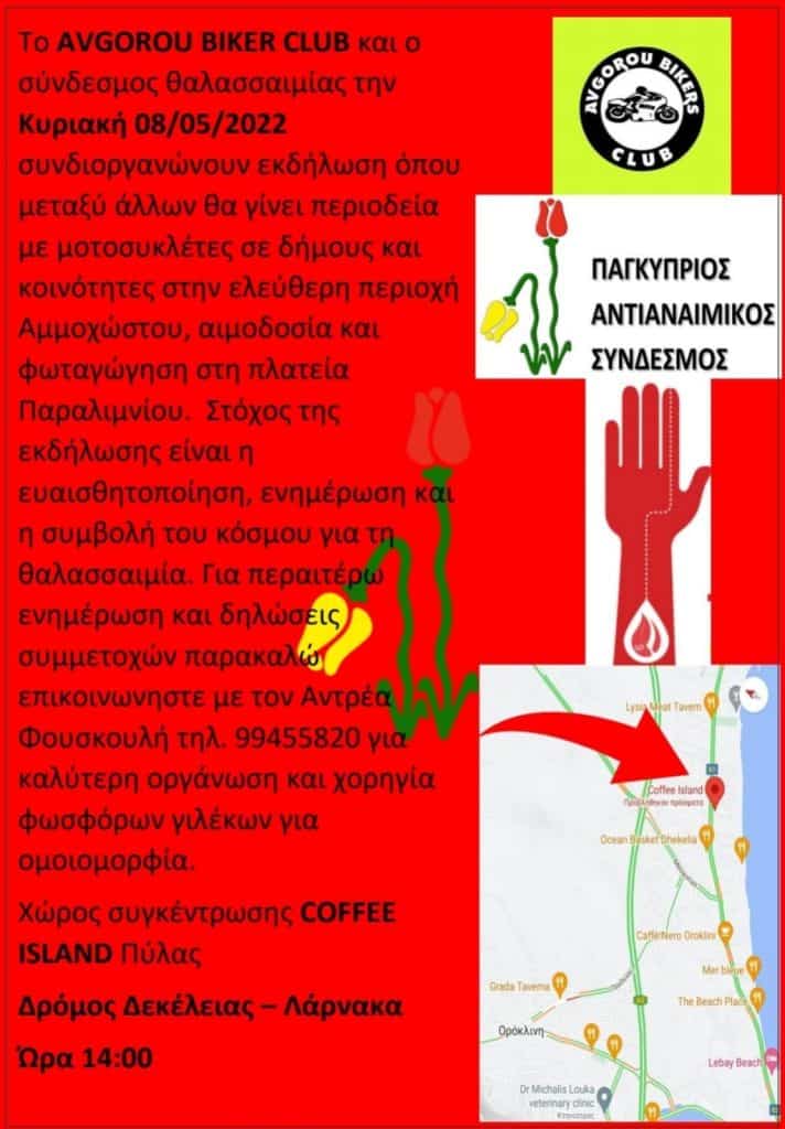 Το Avgorou Biker Club και ο Παγκύπριος Σύνδεσμος Θαλασσαιμίας την Κυριακή 8 Μαΐου 2022 συνδιοργανώνουν εκδήλωση όπου μεταξύ άλλων θα γίνει περιοδεία με μοτοσυκλέτες σε Δήμους και Κοινότητες της επαρχίας Αμμοχώστου, αιμοδοσία και φωταγώγηση στην πλατεία Παραλιμνίου.