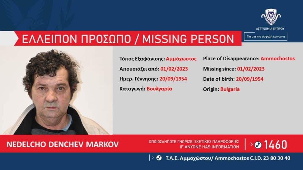 Τη φωτογραφία και τα στοιχεία άντρα ηλικίας 69 ετών, δίνει στη δημοσιότητα η Αστυνομία, με σκοπό τη συλλογή πληροφοριών που μπορεί να βοηθήσουν στον εντοπισμό του. Πρόκειται για τον Nedelcho Denchev MARKOV, ημερομηνία γέννησης 20/09/1954, από Βουλγαρία, άστεγος, ο οποίος ελλείπει από τον Ιανουάριο, 2023, και γίνονται έρευνες προς εντοπισμό του.