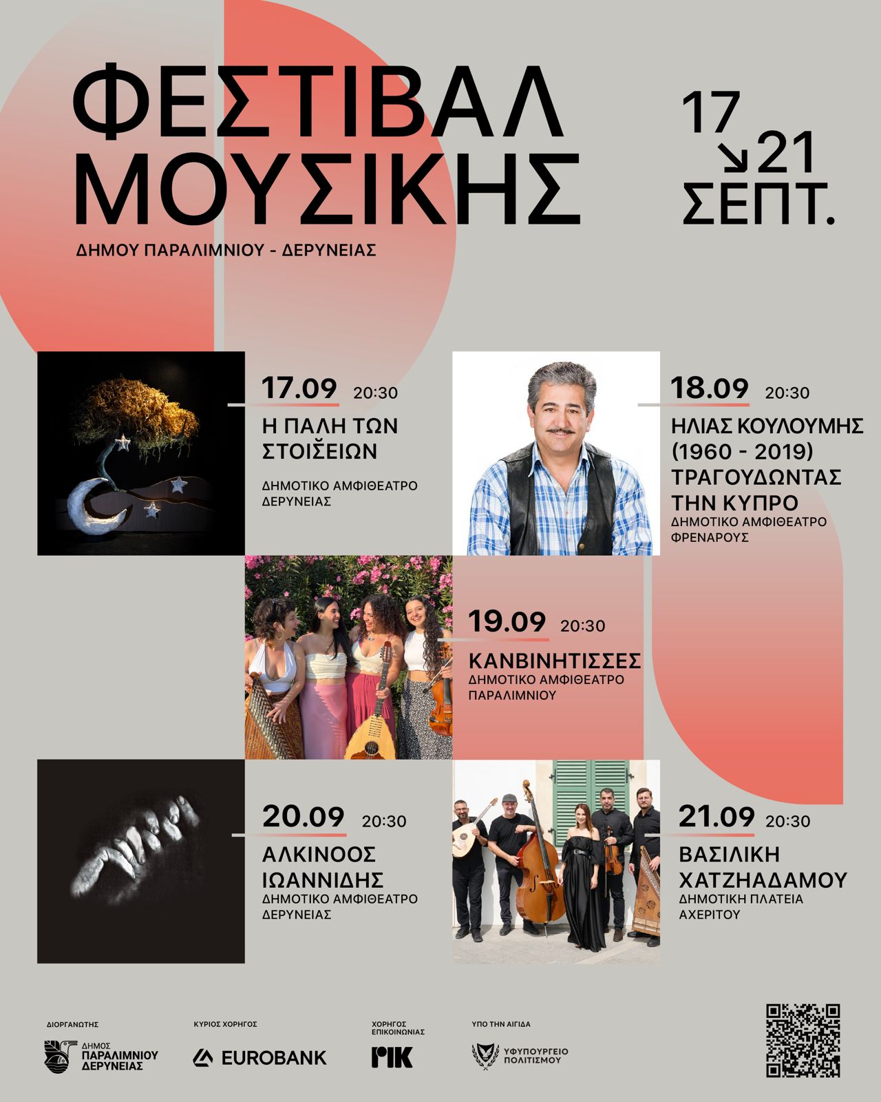 Ο Δήμος Παραλιμνίου-Δερύνειας διοργανώνει από τις 17 μέχρι και τις 21 Σεπτεμβρίου 2025, Φεστιβάλ Μουσικής σε όλα τα δημοτικά του διαμερίσματα με τη συμμετοχή κορυφαίων Kυπρίων καλλιτεχνών.