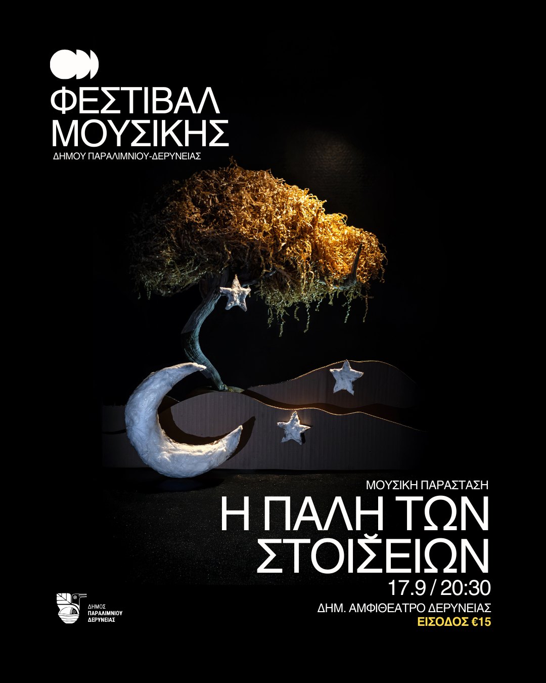 Το φεστιβάλ αρχίζει την Τετάρτη 17 Σεπτεμβρίου, 20:30 στο Δημοτικό Αμφιθέατρο Δερύνειας με Μουσική παράσταση «Η ΠΑΛΗ ΤΩΝ ΣΤΟΙΣΕΙΩΝ»