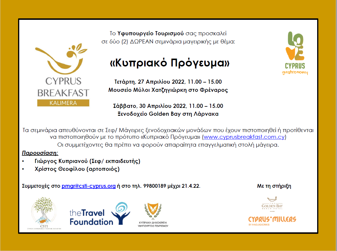 Το Υφυπουργείο Τουρισμού σας προσκαλεί σε δύο δωρεάν εκπαιδευτικά σεμινάρια με θέμα “Κυπριακό Πρόγευμα”. Τα σεμινάρια απευθύνονται σε Σεφ και Μάγειρες.