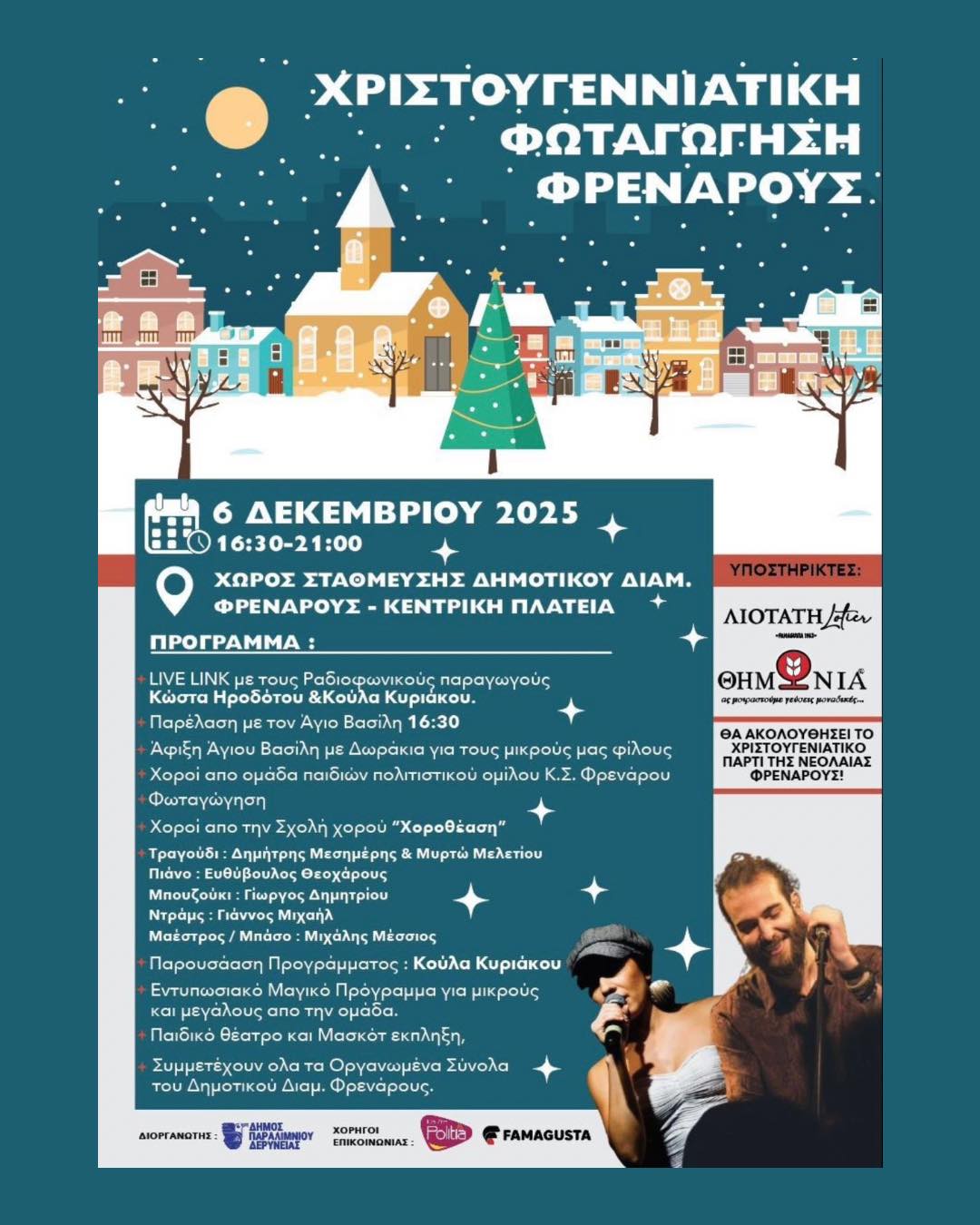 Η Χριστουγεννιατική Φωταγώγηση του Φρενάρους έρχεται στις 6 Δεκεμβρίου 2025 και η ώρα 16:30–21:00 στο Χώρο στάθμευσης δημοτικού διαμερίσματος Φρενάρους – Κεντρική πλατεία