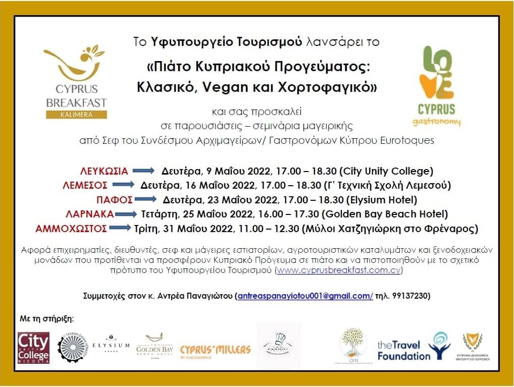 Το Υφυπουργείο Τουρισμού λανσάρει το «Πιάτο Κυπριακού Προγεύματος» και σας προσκαλεί σε ενημερωτικές παρουσιάσεις – σεμινάρια.