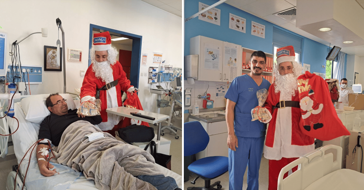 Έπειτα, ο ντυμένος Άγιος Βασίλης μοίρασε δωράκια στα παιδάκια του Παιδιατρικού θαλάμου ενώ παράλληλα χάρισαν χαλλούμια στο νοσηλευτικό προσωπικό καθώς και στην μονάδα αιμοκάθαρσης.