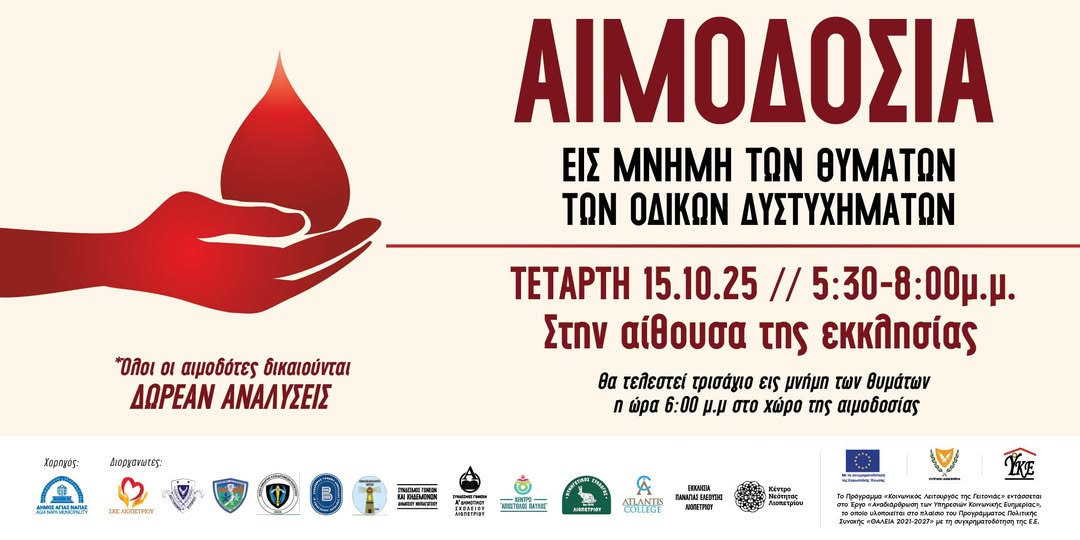 Αιμοδοσία με Μήνυμα Ζωής & Οδικής Ασφάλειας διοργανώνεται στις15.10.25 και η ώρα 5:30-8:00μ.μ. στην Αίθουσα της εκκλησίας Παναγίας Ελεούσης Λιοπετρίου.