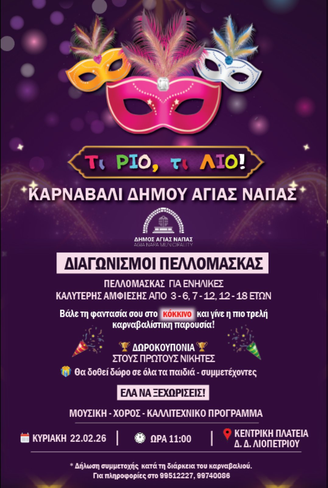 Η εκδήλωση διοργανώνεται από τον Δήμο Αγίας Νάπας και επιστρέφει δυναμικά για δέκατη συνεχή χρονιά, αποτελώντας μία από τις πιο ξεχωριστές καρναβαλίστικες διοργανώσεις της Κύπρου. Πρόκειται για ένα γιορτινό πρωινό που συνδυάζει την παράδοση με τη σύγχρονη διασκέδαση, μετατρέποντας την Κεντρική Πλατεία του Λιοπετρίου και τη λεωφόρο Ακροπόλεως σε ένα πολύχρωμο σκηνικό γεμάτο χρώμα, μουσική, γέλιο και δημιουργικότητα.