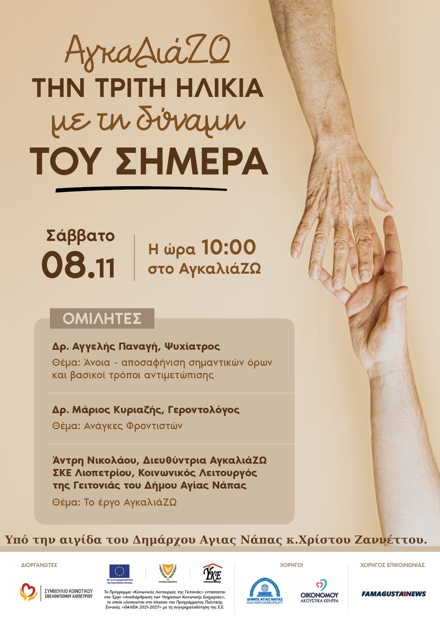 Το ΑγκαλιάΖΩ ΣΚΕ Λιοπετρίου του Δήμου Αγίας Νάπας διοργανώνει το Σάββατο, 8 Νοεμβρίου, στις 10:00 π.μ., στο χώρο του ΑγκαλιάΖΩ, μια ειδική εκδήλωση αφιερωμένη στην Τρίτη Ηλικία με θέμα «Αγκαλιάζω την Τρίτη Ηλικία με τη δύναμη του σήμερα». Η εκδήλωση στοχεύει στην ενημέρωση και υποστήριξη των ηλικιωμένων και των φροντιστών τους, προσφέροντας χρήσιμες γνώσεις για την καθημερινότητά τους.