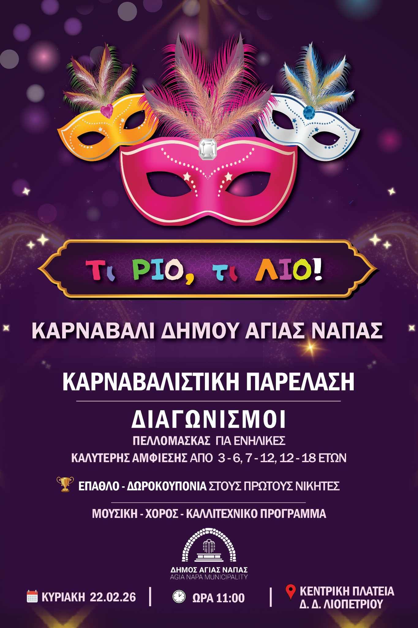 Ο Δήμος Αγίας Νάπας σας προσκαλεί σε ένα ξεχωριστό καρναβαλίστικο πρωινό γεμάτο χρώμα, μουσική και χαμόγελα, για μικρούς και μεγάλους την Κυριακή 22 Φεβρουαρίου 2026 και η ώρα 11:00 στην Κεντρική Πλατεία Δ.Δ. Λιοπετρίου.