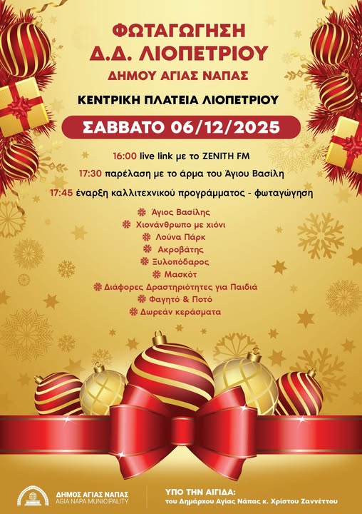 Ο Δήμος Αγίας Νάπας και το Δημοτικό Διαμέρισμα Λιοπετρίου προσκαλούν μικρούς και μεγάλους στη φετινή Χριστουγεννιάτικη Φωταγώγηση, που θα πραγματοποιηθεί το Σάββατο 06 Δεκεμβρίου 2025 στην Κεντρική Πλατεία Λιοπετρίου, σε μια ατμόσφαιρα γεμάτη μουσική, εκπλήξεις και παραμυθένια γιορτινή λάμψη.
