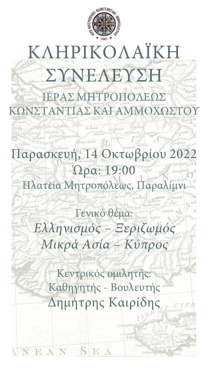 Η Μητρόπολη Κωνσταντίας και Αμμοχώστου συγκαλεί φέτος την ένατη σε σειρά Κληρικολαϊκή Συνέλευσή της. Την ευκαιρία της σύγκλησης της φετινής Κληρικολαϊκής Συνέλευσης, με γενικό θέμα «Ελληνισμός – Ξεριζωμός. Μικρά Ασία – Κύπρος», παρέχει η επέτειος μνήμης της συμπλήρωσης 100 χρόνων από τη Μικρασιατική Καταστροφή. Το γενικό θέμα θα αναπτυχθεί από τον Πανιερώτατο Μητροπολίτη Κωνσταντίας και Αμμοχώστου Βασίλειο στην εισαγωγική του ομιλία. Κύριος ομιλητής στη Συνέλευση θα είναι ο Δημήτρης Καιρίδης, Καθηγητής Διεθνών Σχέσεων στο Πάντειο Πανεπιστήμιο, βουλευτής του Βόρειου Τομέα Αθηνών στο Ελληνικό Κοινοβούλιο, συγγραφέας και αναλυτής διεθνών θεμάτων και διεθνούς επικαιρότητας. Ο Καθηγητής Καιρίδης θα αναπτύξει το θέμα «Εκατό χρόνια από τη Μικρασιατική Καταστροφή: Ο Τουρκικός Αναθεωρητισμός και ο Ελληνισμός σήμερα, στην Κύπρο, την Ανατολική Μεσόγειο, το Αιγαίο και τη Θράκη».
