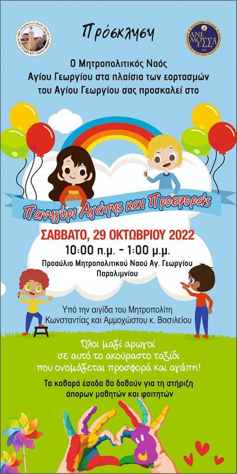 Ο Μητροπολιτικός Ναός Αγίου Γεωργίου με ανακοίνωση του προσκαλεί το κοινό στο Πανηγύρι Αγάπης και Προσφοράς που διοργανώνεται το Σάββατο, 29 Οκτωβρίου από τις 10:00 το πρωί μέχρι τις 1:00μ.μ στο Προαύλιο του Μητροπολιτικού Ναού Αγίου Γεωργίου στο Παραλίμνι.