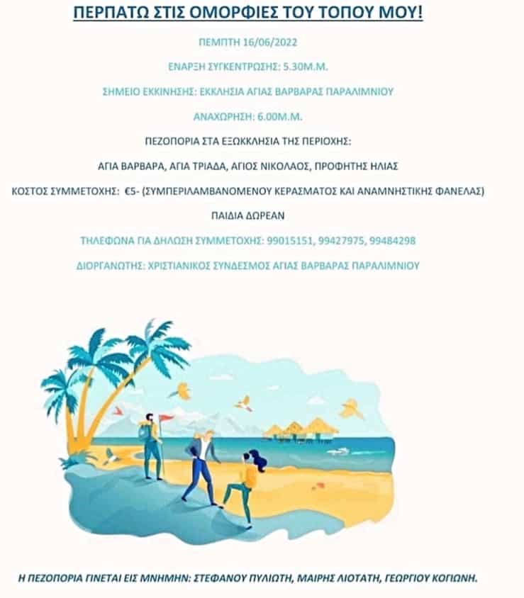 Με σημείο εκκίνησης την εκκλησία Αγίας Βαρβάρας, η πεζοπορία έχει σκοπό το κοινό να γνωρίσει τις ομορφιές του τόπου μας.
