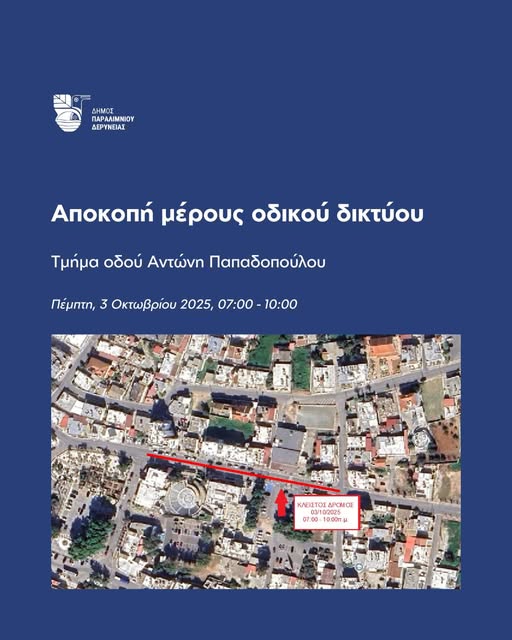 Ο Δήμος Παραλιμνίου – Δερύνειας ενημερώνει ότι την Παρασκευή 3 Οκτωβρίου 2025 από τις 07:00 π.μ. μέχρι και τις 10:00 π.μ. το τμήμα της οδού Αντώνη Παπαδοπούλου στο Παραλίμνι (από συμβολή με οδό Αγίου Γεωργίου – οίκημα ΣΕΚ μέχρι και τη συμβολή με την οδό Αρχ. Μακαρίου Β’) θα παραμείνει κλειστό για σκοπούς απαιτούμενων εργασιών ανέγερσης του Δημοτικού Στεγασμένου Χώρου Στάθμευσης.