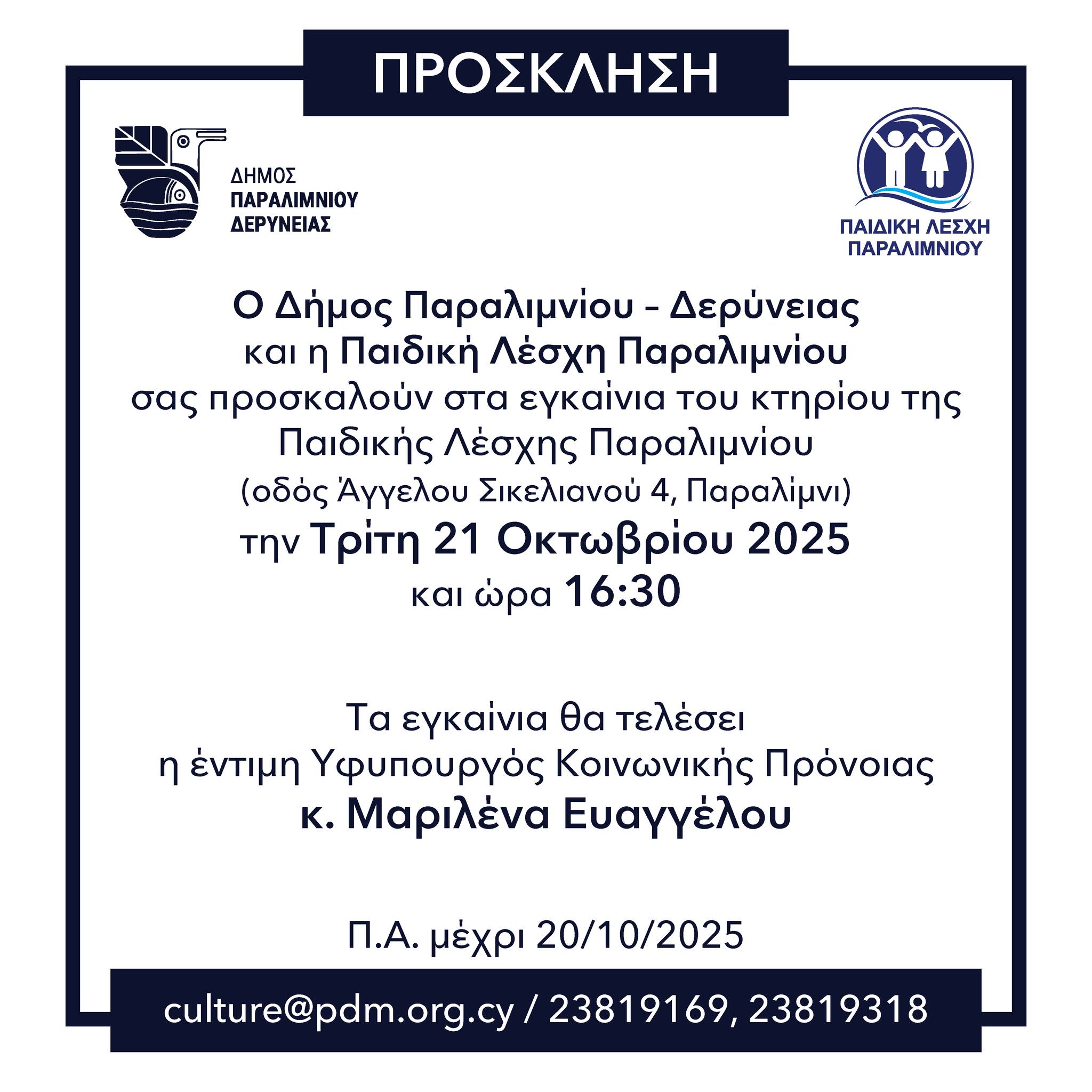 Ο Δήμος Παραλιμνίου – Δερύνειας και η Παιδική Λέσχη Παραλιμνίου σας προσκαλούν στα εγκαίνια του κτηρίου της Παιδικής Λέσχης Παραλιμνίου (οδός Άγγελου Σικελιανού 4, Παραλίμνι) την Τρίτη 21 Οκτωβρίου 2025 και ώρα 4:30μ.μ.