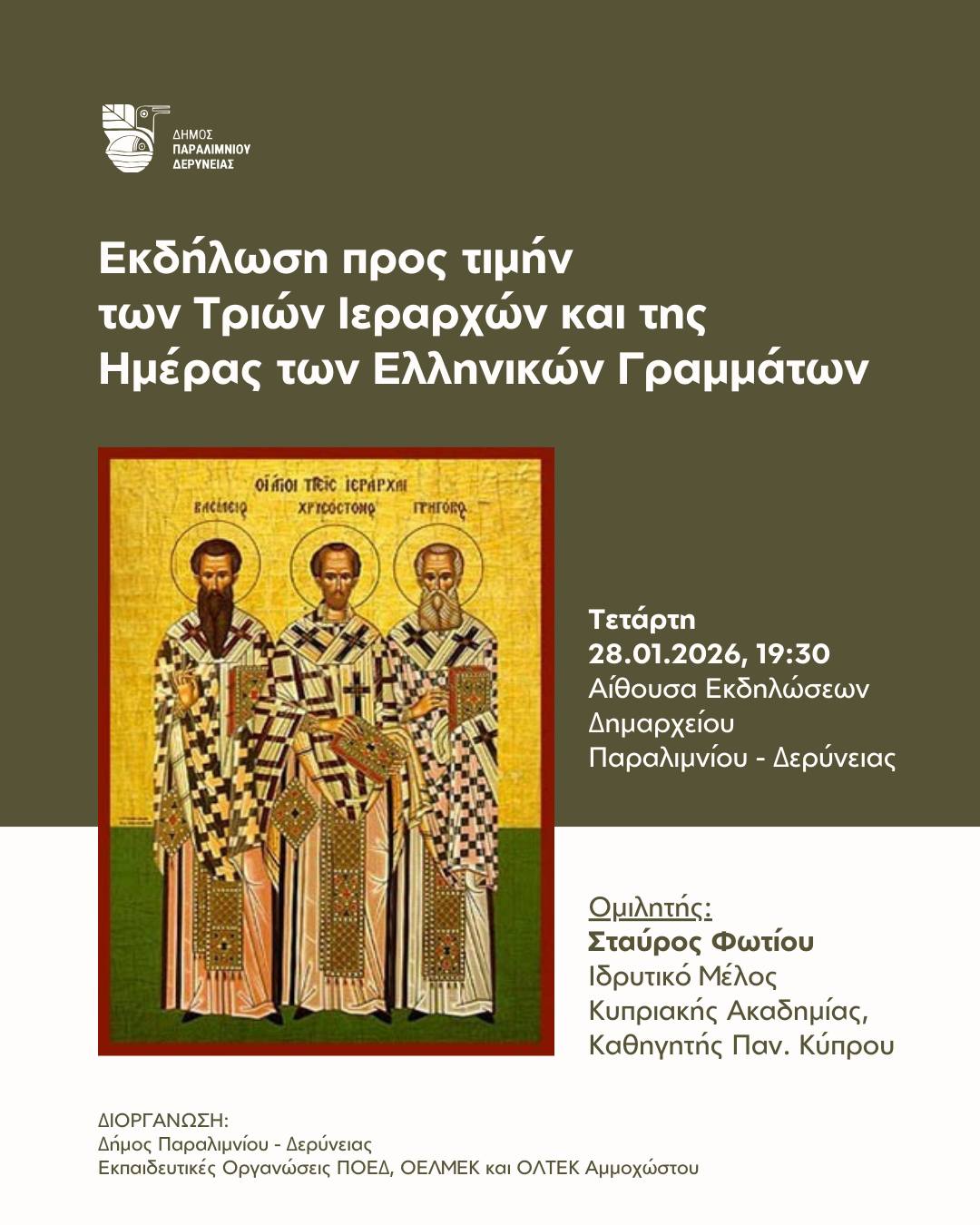Ο Δήμος Παραλιμνίου – Δερύνειας και οι Εκπαιδευτικές Οργανώσεις ΠΟΕΔ, ΟΕΛΜΕΚ και ΟΛΤΕΚ Αμμοχώστου σας προσκαλούν στην εκδήλωση προς τιμή των Τριών Ιεραρχών και της Ημέρας των Ελληνικών Γραμμάτων την Τετάρτη 28 Ιανουαρίου 2026, ώρα 19:30 στην Αίθουσα εκδηλώσεων Δημαρχείου Παραλιμνίου – Δερύνειας