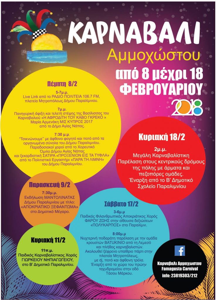 Η ελεύθερη επαρχία Αμμοχώστου συμμετέχει στο «Καρναβάλι Αμμοχώστου 2018» με τους Δήμους Παραλιμνίου, Αγίας Νάπας, Σωτήρας και Δερύνειας, και τις Κοινότητες Βρυσούλων – Αχερίτου και Φρενάρους, να δηλώνουν παρόντες στην μεγαλύτερη και πιο ξέφρενη εκδήλωση της περιοχής.