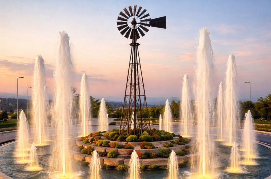Κεντρικό στοιχείο του χώρου θα αποτελεί ένας γεωργικός ανεμόμυλος που θα αναδεικνύεται ως ορόσημο του Δήμου και θα περιβάλλεται κυκλικά από υδάτινη εγκατάσταση με διαδοχικές δέσμες νερού φωτιζόμενες εναλλακτικά με χρώματά, που θα ανεβοκατεβαίνουν αναδεικνύοντας τον συμβολικό χαρακτήρα του νερού.
