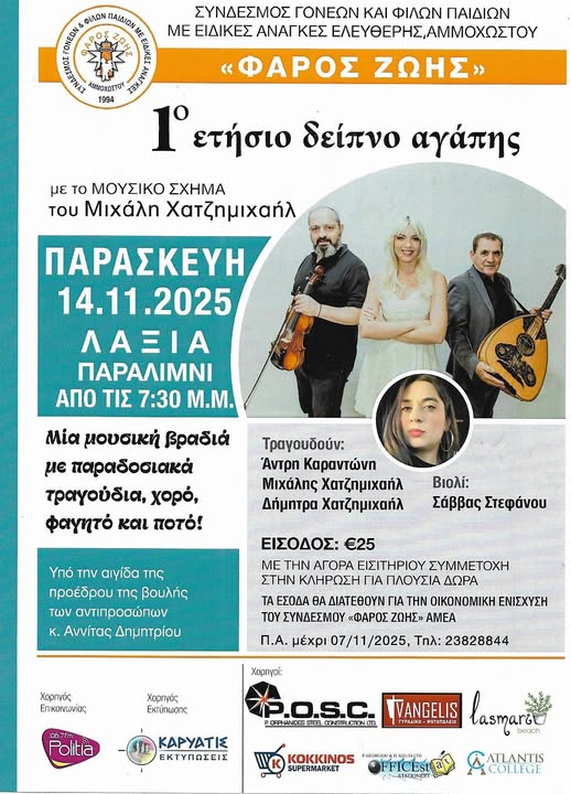 Ο Σύνδεσμος Γονέων και Φίλων Παιδιών με Ειδικές Ανάγκες Ελευθέρης Αμμοχώστου «Φάρος Ζωής» διοργανώνει το 1ο ετήσιο δείπνο αγάπης.