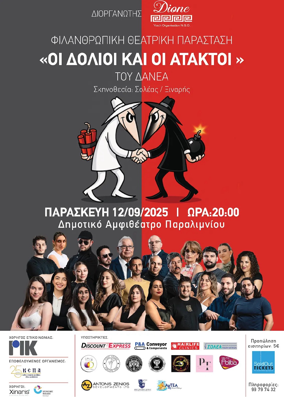 Η παράσταση τελεί υπό την αιγίδα του Δήμου Παραλιμνίου Δερύνειας και τα καθαρά έσοδα από την παράσταση θα δοθούν για στήριξη του ΚΕΠΑ «Άγιος Χριστόφορος»