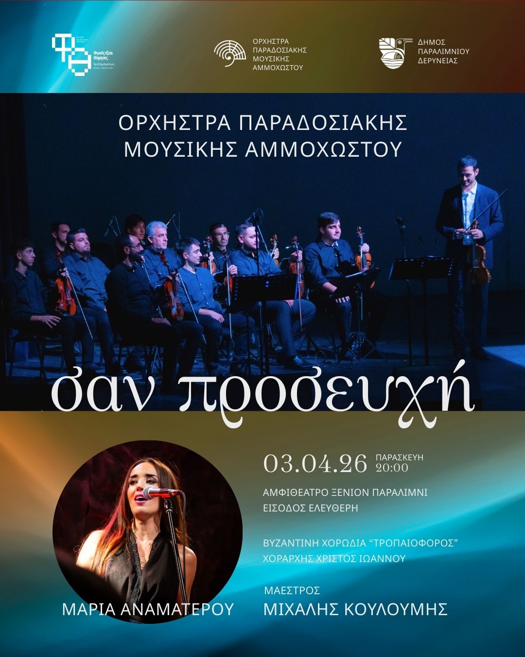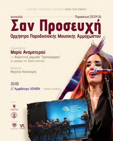 Στο πλαίσιο του Β’ Φεστιβάλ Παραδοσιακού Πολιτισμού “Φωνές τζιαι Θύμησες” ο Δήμος Παραλιμνίου – Δερύνειας παρουσιάζει μία ξεχωριστή συναυλία με βυζαντινούς ύμνους, αφιερωμένη στη Μεγάλη Εβδομάδα και στην Ανάσταση, με τίτλο “Σαν Προσευχή” με τη συμμετοχή της Μαρίας Αναματερού και της Βυζαντινής Χορωδίας “Τροπαιοφόρος” με χοράρχη τον Χρίστο Ιωάννου. Μαέστρος: Μιχάλης Κουλουμής.