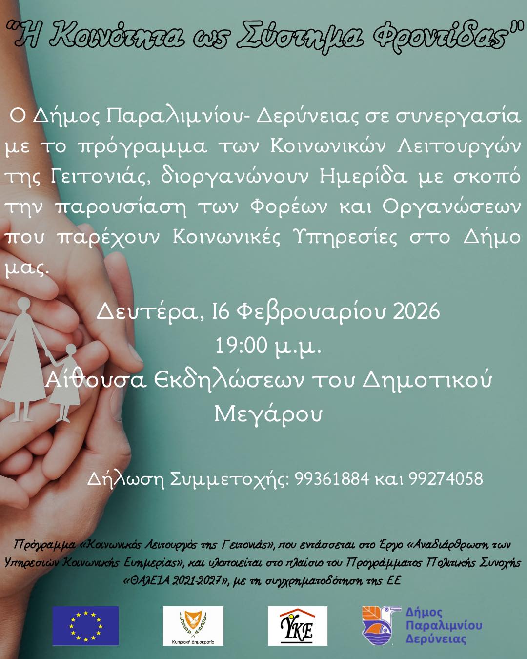 Ο Δήμος Παραλιμνίου – Δερύνειας, σε συνεργασία με το πρόγραμμα «Κοινωνικός Λειτουργός της Γειτονιάς», διοργανώνει Ημερίδα με στόχο την παρουσίαση των Φορέων και Οργανώσεων που προσφέρουν κοινωνικές υπηρεσίες στον Δήμο μας. Μια συνάντηση αφιερωμένη στον άνθρωπο, στη συνεργασία και στη δύναμη της κοινότητας.