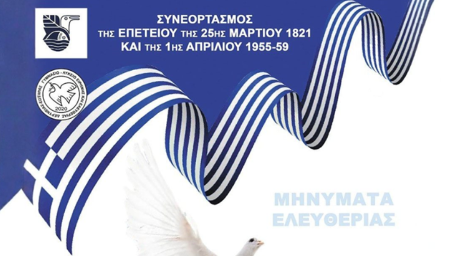Ο Δήμος Παραλιμνίου – Δερύνειας, η Διεύθυνση, ο Καθηγητικός Σύλλογος και η Μαθητική Κοινότητα του Γυμνασίου – Λυκείου «Ειρήνης και Ελευθερίας» Δερύνειας – Σωτήρας σας προσκαλούν στην Πάνδημο Καλλιτεχνική Εκδήλωση για τον εορτασμό της 25ης Μαρτίου 1821 και της 1ης Απριλίου 1955-59.