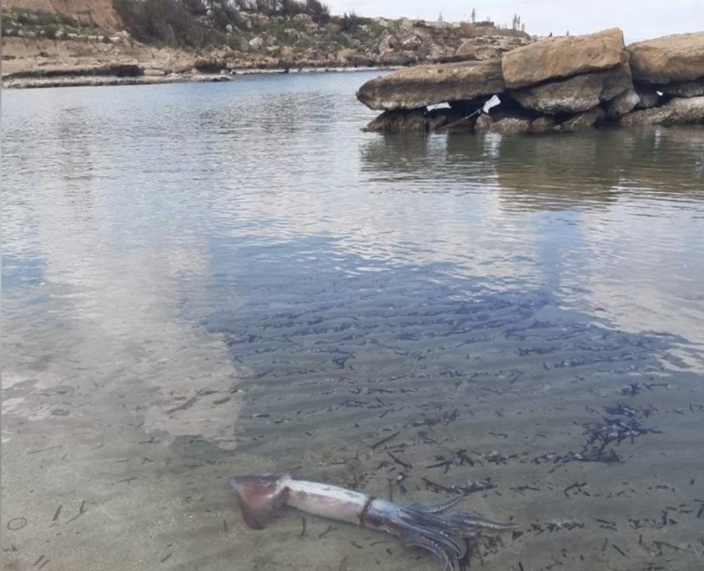 Τεράστιο μαλάκιο τεσσάρων κιλών εγκλωβίστηκε σε μικρό αβαθές λιμανάκι αφού όπως όλα δείχνουν το κοπάδι του το κυνήγησαν δελφίνια κι αυτό έχασε τον προσανατολισμό και την ισορροπία του από την απότομη αυξομείωση βάθους και εγκλωβίστηκε εκεί.
