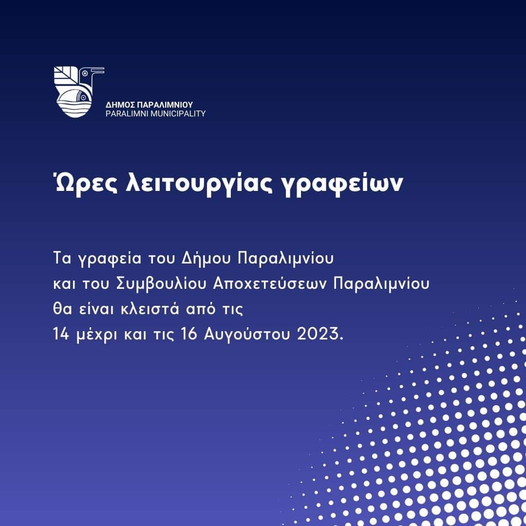 Τα γραφεία του Δήμου Παραλιμνίου και του Συμβουλίου Αποχετεύσεων Παραλιμνίου θα είναι κλειστά από τις 14 μέχρι και τις 16 Αυγούστου 2023.