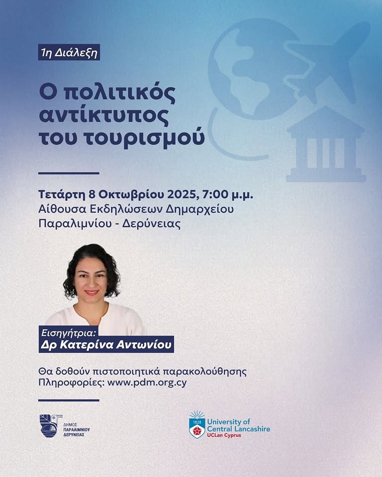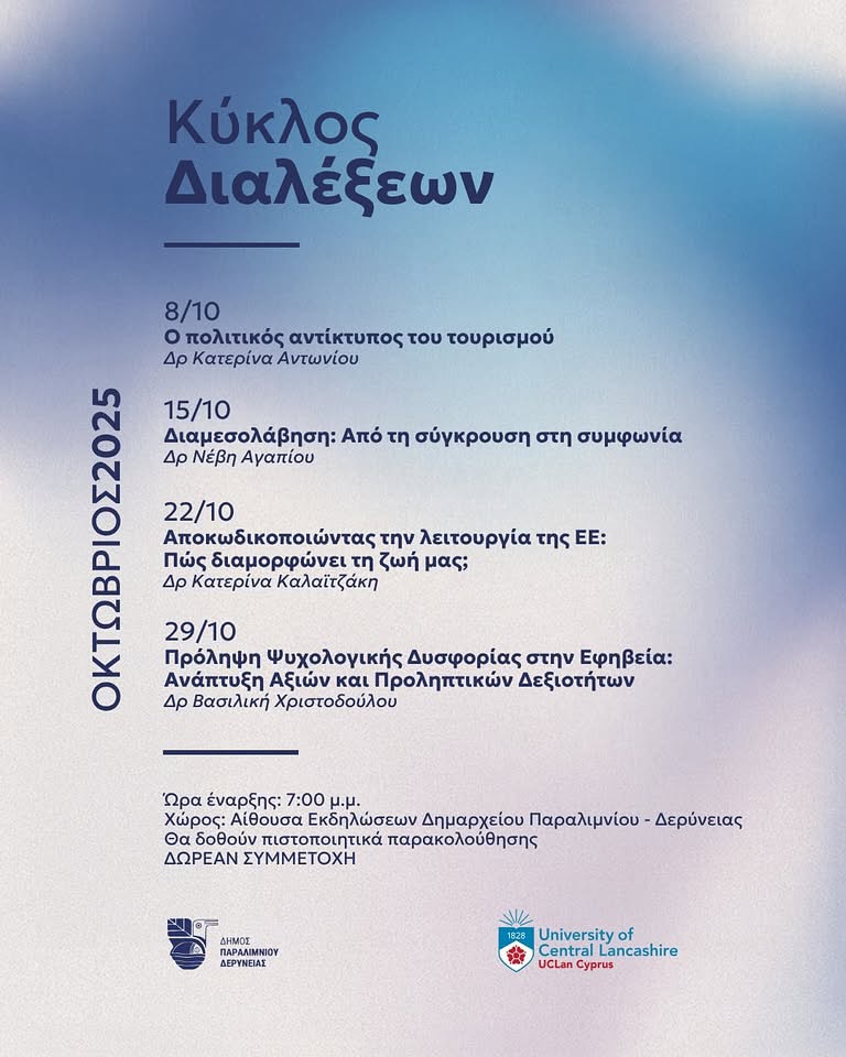Ο Δήμος Παραλιμνίου – Δερύνειας σε συνεργασία με το Πανεπιστήμιο UCLAN Cyprus διοργανώνουν Κύκλο Διαλέξεων με δωρεάν συμμετοχή κάθε Τετάρτη από τις 8 μέχρι και τις 29 Οκτωβρίου 2025 στην αίθουσα εκδηλώσεων του Δημαρχείου Παραλιμνίου – Δερύνειας.