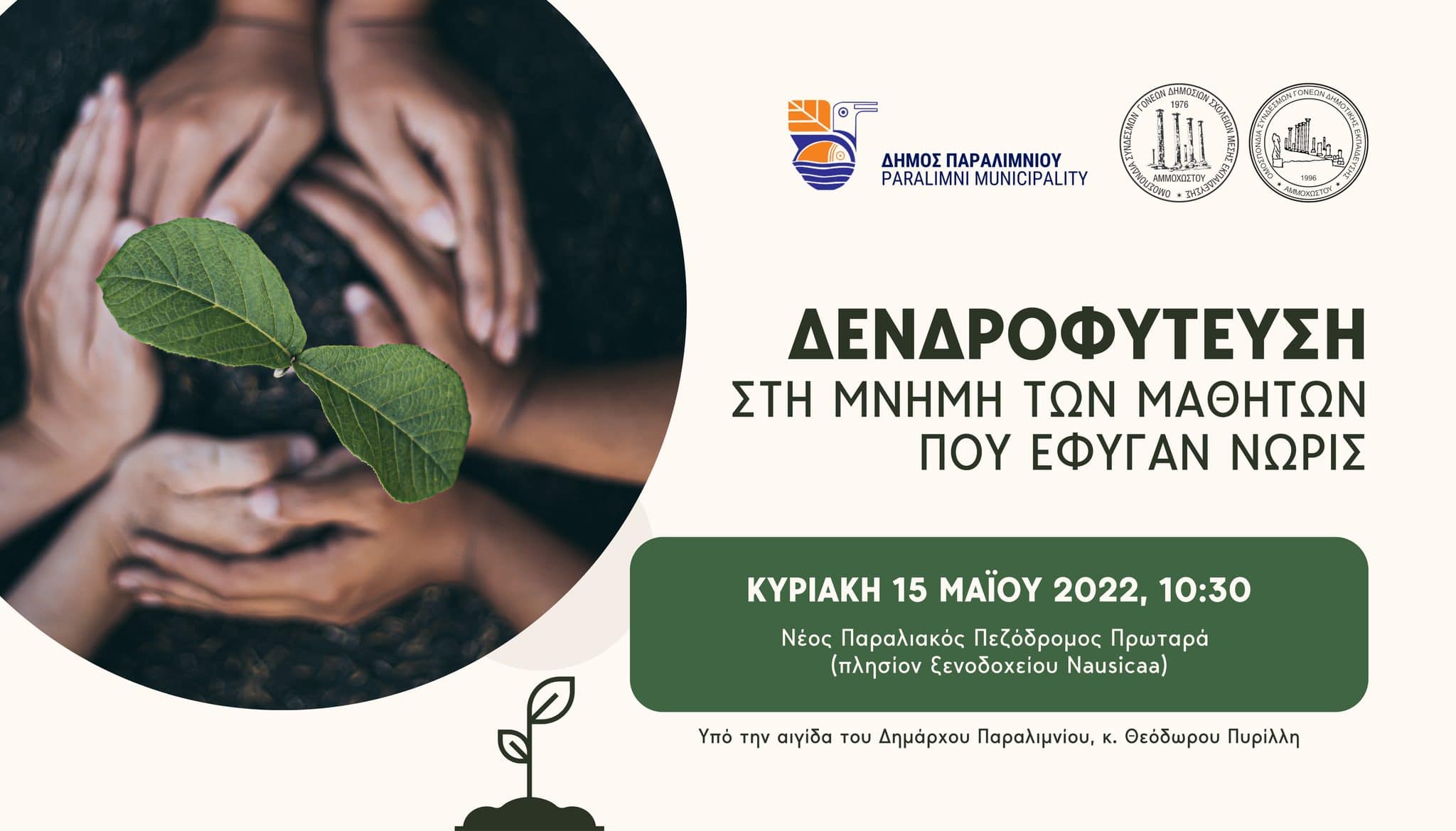 Οι Ομοσπονδίες Συνδέσμων Γονέων Μέσης και Δημοτικής Εκπαίδευσης Αμμοχώστου σε συνεργασία με τον Δήμο Παραλιμνίου διοργανώνουν εκδήλωση δενδροφύτευσης στη μνήμη των παιδιών που έφυγαν νωρίς και δεν αποφοίτησαν από τα σχολεία.