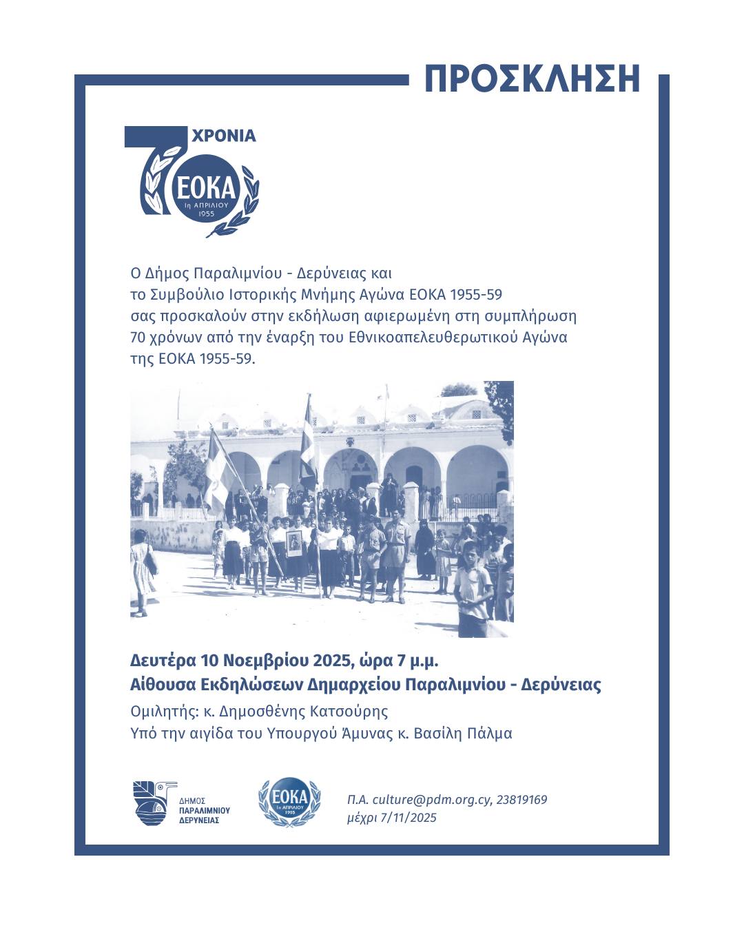Ο Δήμος Παραλιμνίου – Δερύνειας και το Συμβούλιο Ιστορικής Μνήμης Αγώνα ΕΟΚΑ 1955-59 σας προσκαλούν στην εκδήλωση αφιερωμένη στη συμπλήρωση 70 χρόνων από την έναρξη του Εθνικοαπελευθερωτικού Αγώνα της ΕΟΚΑ 1955-59.