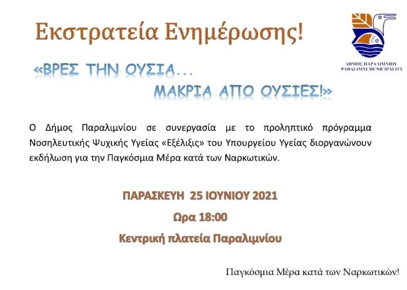 Εκδήλωση-Εκστρατεία ενημέρωσης για την Παγκόσμία ημέρα κατά των ναρκωτικών θα γίνει την Παρασκευή, 25 Ιουνίου στο Παραλίμνι.