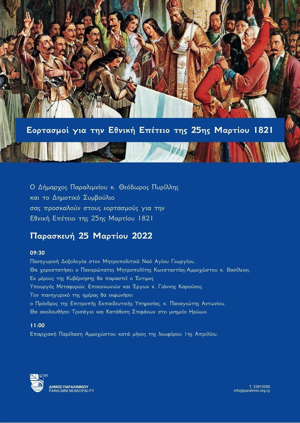 Ο Δήμαρχος Παραλιμνίου κ. Θεόδωρος Πυρίλλης και το Δημοτικό Συμβούλιο σας προσκαλούν στους εορτασμούς για την Εθνική Επέτειο της 25ης Μαρτίου 1821