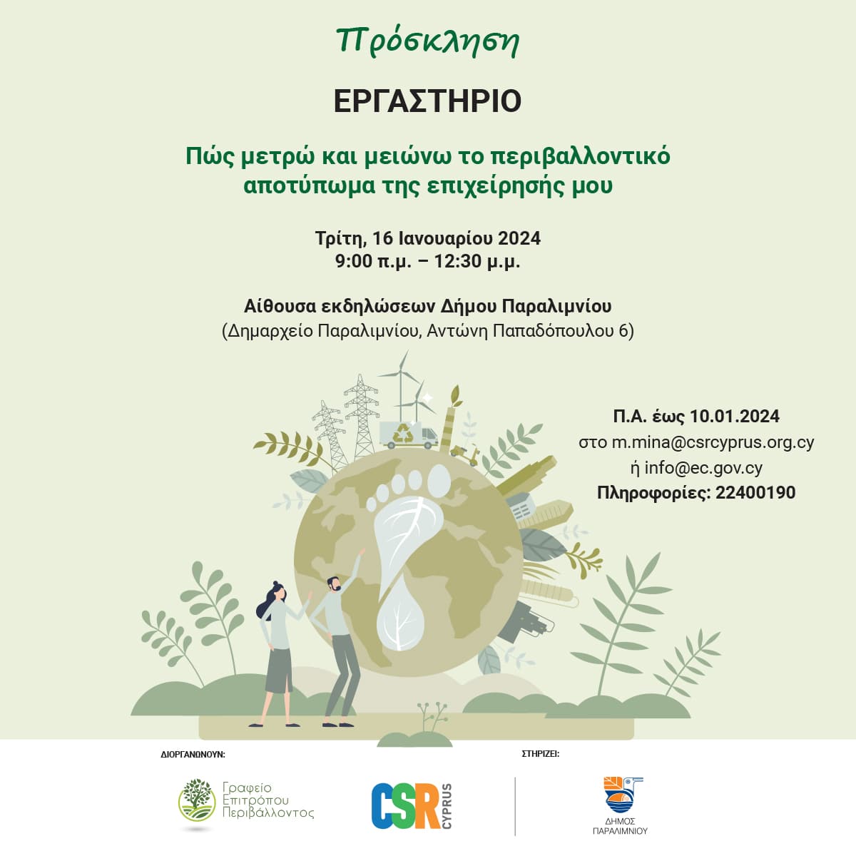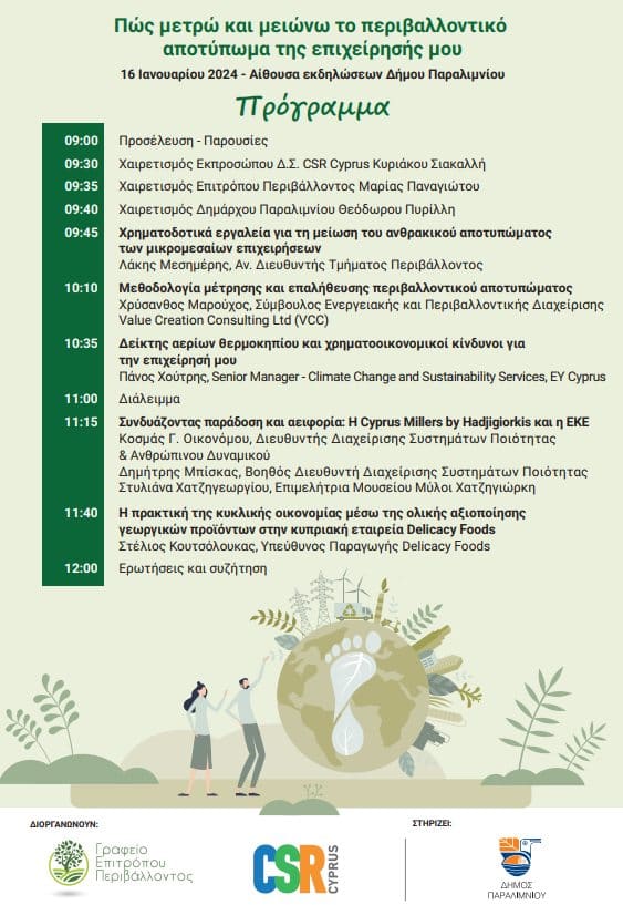 Το Γραφείο Επιτρόπου Περιβάλλοντος με το CSR Cyprus συνδιοργανώνουν εργαστήρι με θέμα πώς μετρώ και μειώνω το περιβαλλοντικό αποτύπωμα της επιχείρησής μου;.