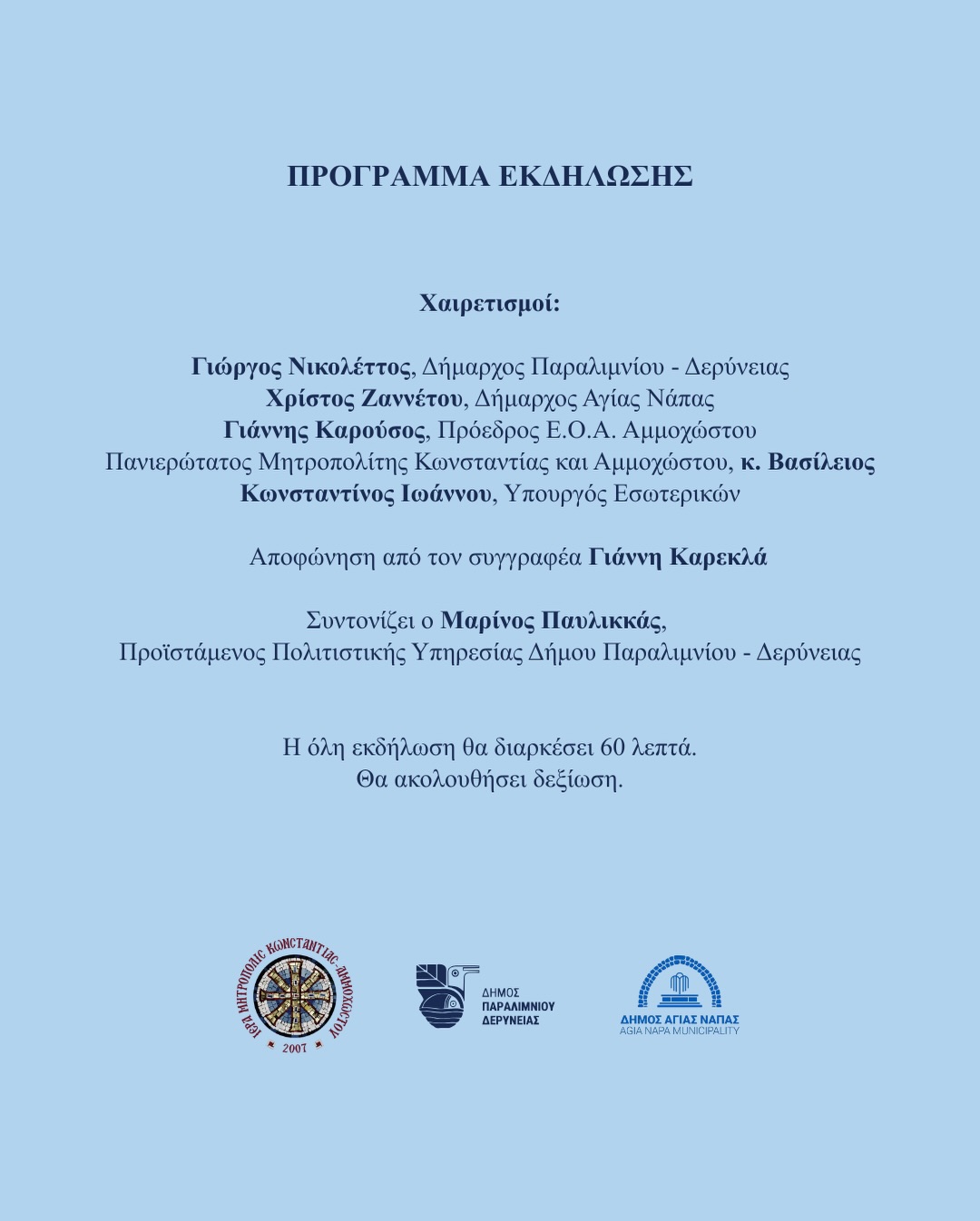 Συντονίζει ο Μαρίνος Παυλικκάς, Προϊστάμενος Πολιτιστικής Υπηρεσίας Δήμου Παραλιμνίου – Δερύνειας.