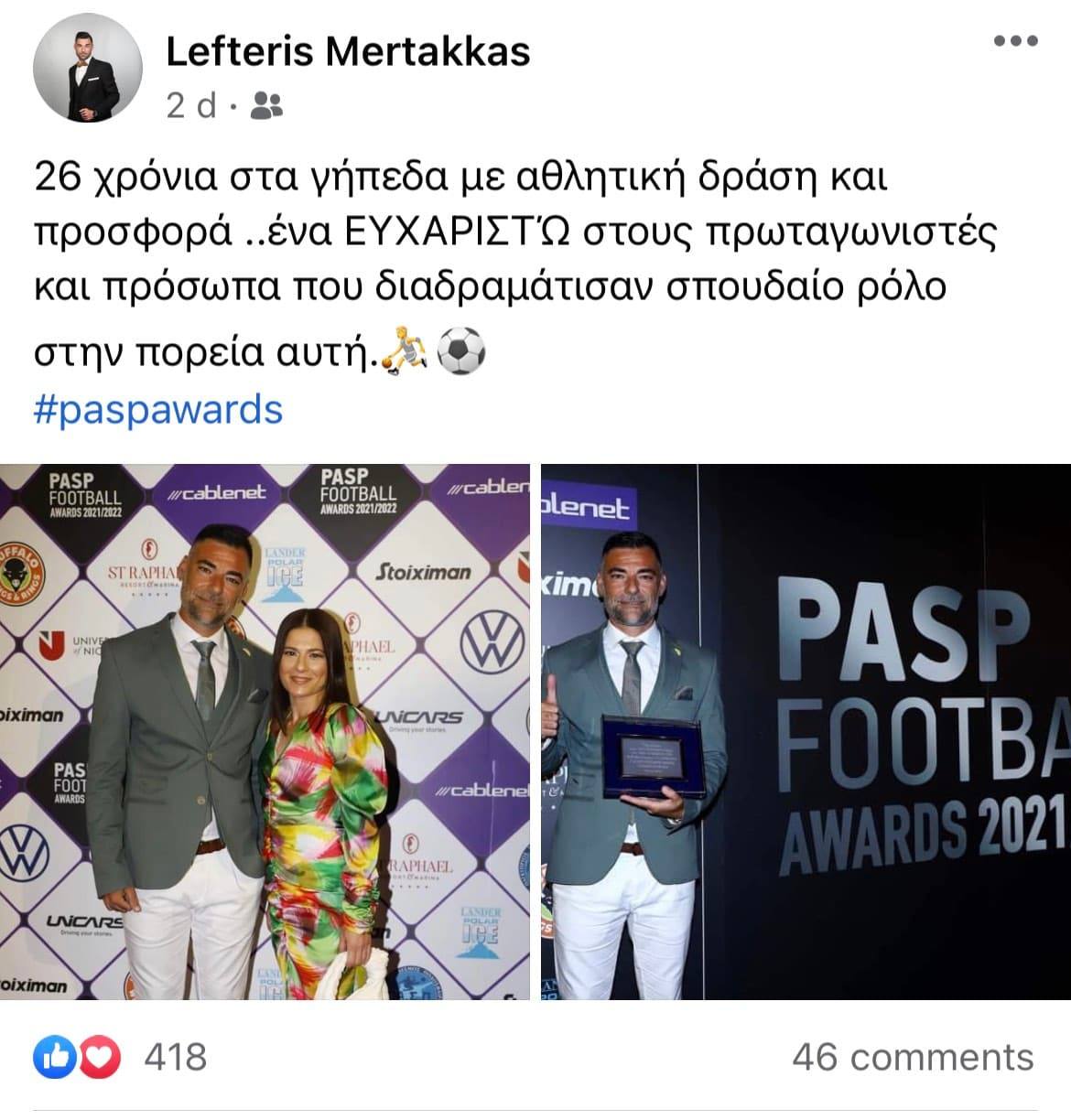 Με ανάρτηση στα social media ο Κωστάκης Αρτυματάς και Λευτέρης Μέρτακκας, αναφέρθηκαν στην βράβευση τους.