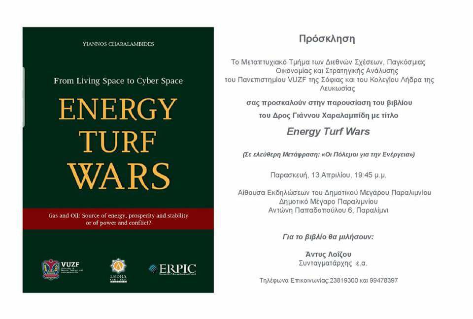 Η Τουριστική, Εμπορική και Βιομηχανική Εταιρεία Αμμοχώστου, το Μεταπτυχιακό Τμήμα των Διεθνών Σχέσεων, Παγκόσμιας Οικονομίας και Στρατηγικής Ανάλυσης του Πανεπιστημίου VYZF της Σόφιας και το Κολλέγιο «Λήδρα» Λευκωσίας διοργανώνουν την εκδήλωση παρουσίασης βιβλίου του Δόκτορος Γιάννου Χαραλαμπίδη με τίτλο «Energy Turf Wars”.