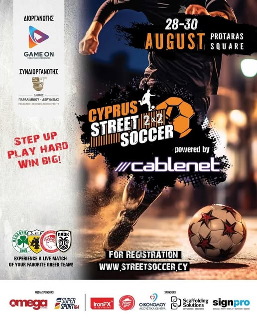Η Game On Marketing διοργανώνει το Cyprus Street Soccer 2×2 tournament για όλες τις ηλικίες από τις 28 έως τις 30 Αυγούστου στην Πλατεία Λευκόλλα στον Πρωταρά συνδιοργανωτή τον Δήμο Παραλιμνίου – Δερύνειας.