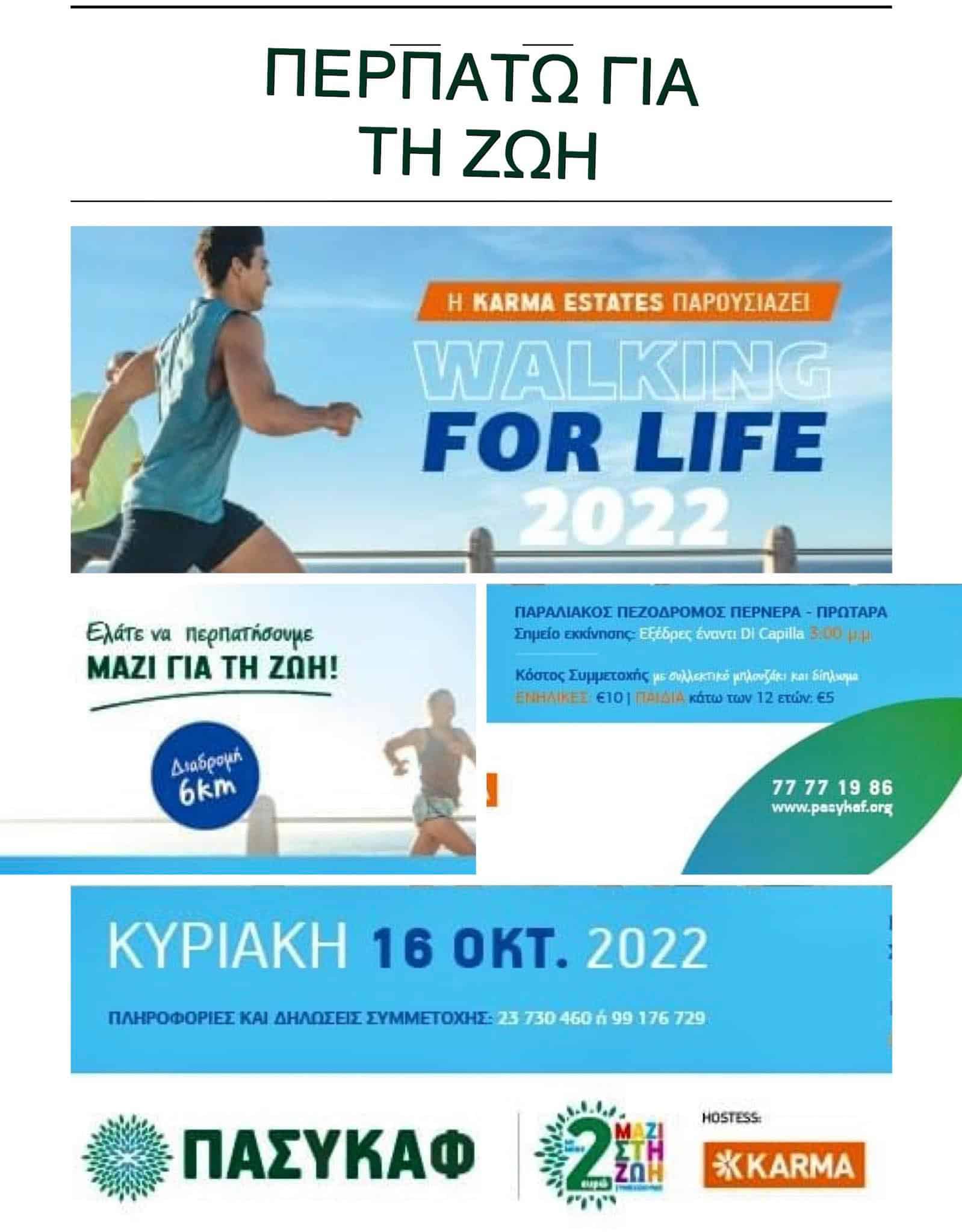 Την Κυριακή 16 Οκτωβρίου 2022, στις 3.00μ.μ. στον παραλιακό πεζόδρομο Περνέρα -Πρωταρά ο ΠΑΣΥΚΑΦ διοργανώνει την εκδήλωση WALKING FOR LIFE.