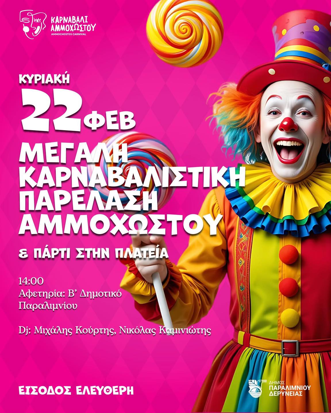 Το μεγαλύτερο αποκριάτικο ραντεβού της χρονιάς έφτασε την Κυριακή 22 ΦΕΒΡΟΥΑΡΙΟΥ και η ώρα 14:00 με αφετηρία το Β’ Δημοτικό Παραλιμνίου. Ακολουθεί Πάρτι στην πλατεία Αγίου Γεωργίου στο Παραλίμνι με DJ τον Μιχάλη Κούρτη και τον Νικόλα Καμινιώτη. Φορέστε τις στολές σας και ελάτε να ζήσουμε όλοι μαζί την απόλυτη καρναβαλική εμπειρία!. Η Καρναβαλίστικη Παρέλαση θα μεταδίδεται ζωντανά από την τηλεόραση του Σίγμα (14:00-16:00). Η είσοδος είναι ελεύθερη για το κοινό.