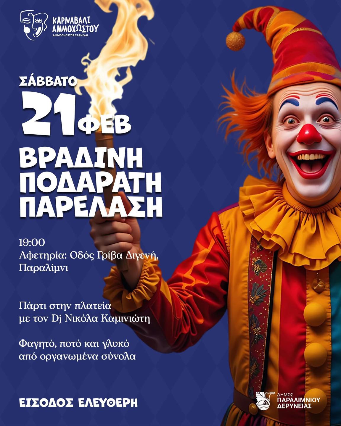 Η Ποδαράτη παρέλαση θα γίνει το Σάββατο 21 ΦΕΒΡΟΥΑΡΙΟΥ και η ώρα 19:00 με αφετηρία την Οδό Γρίβα Διγενή, Παραλίμνι. Ο Τερματισμός και το πάρτι θα γίνει στην πλατεία Αγίου Γεωργίου με DJ τον Νικόλα Καμινιώτη. Θα υπάρχει άφθονο Φαγητό, ποτό και γλυκό από οργανωμένα σύνολα.