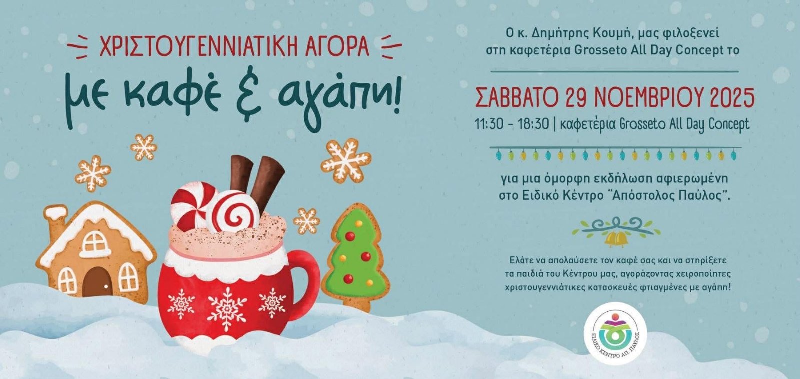Χριστουγεννιάτικη Αγορά με Καφέ & Αγάπη διοργανώνεται αυτό το Σάββατο, 29 Νοεμβρίου, στην καφετέρια Grosseto All Day Concept για μια ξεχωριστή εκδήλωση, αφιερωμένη στο Ειδικό Κέντρο “Απόστολος Παύλος”.
