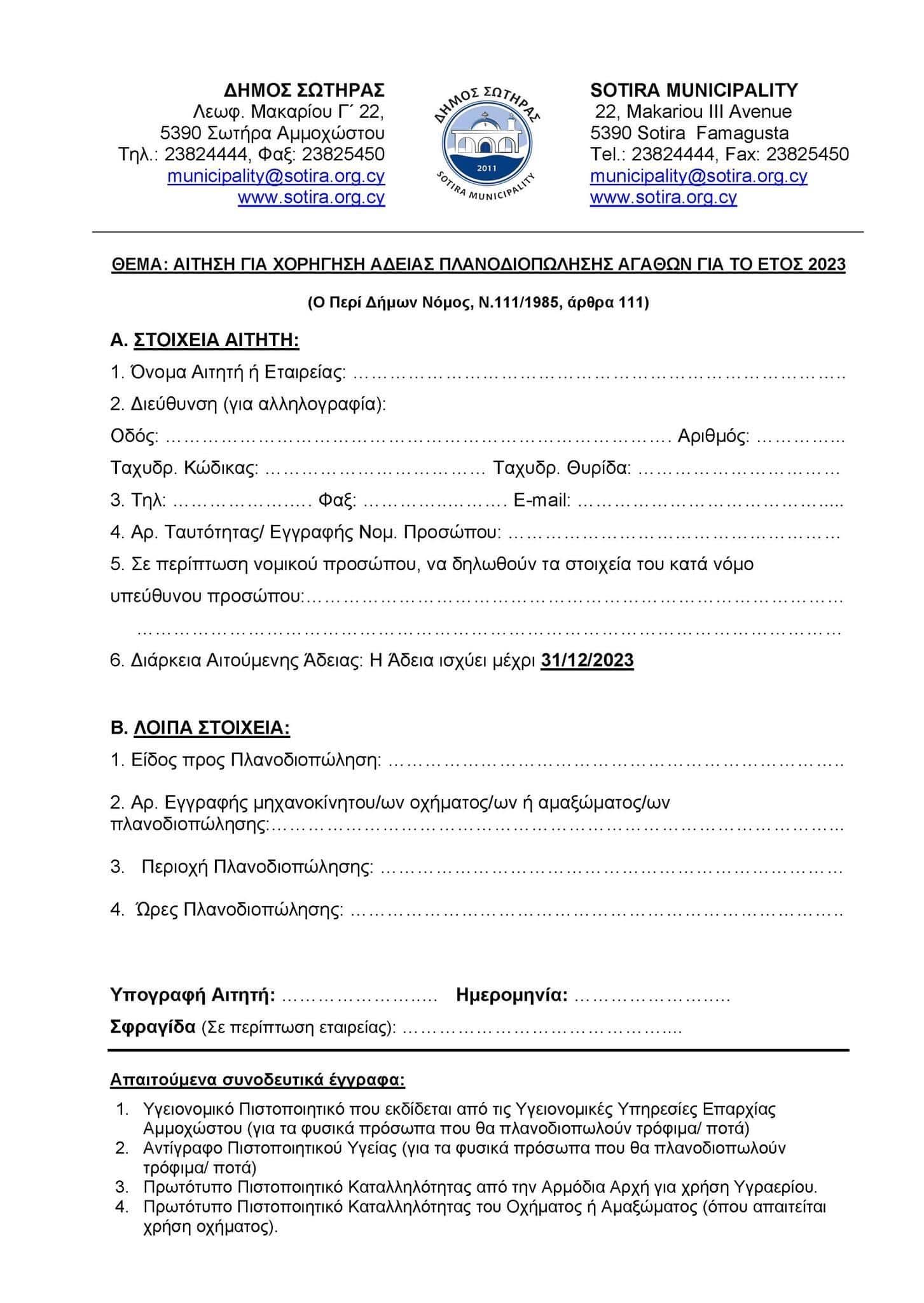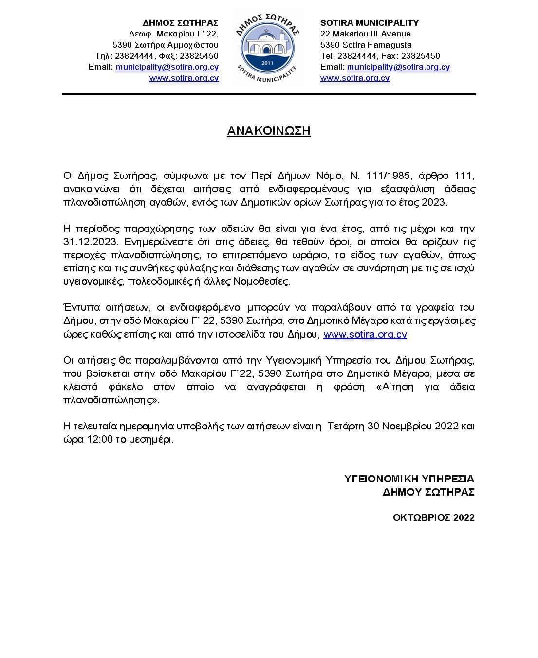 O Δήμος Σωτήρας, σύμφωνα με τον Περί Δήμων Νόμο, Ν. 111/1985, άρθρο 111, ανακοινώνει ότι δέχεται αιτήσεις από ενδιαφερομένους για εξασφάλιση άδειας πλανοδιοπώληση αγαθών, εντός των Δημοτικών ορίων Σωτήρας για το έτος 2023.