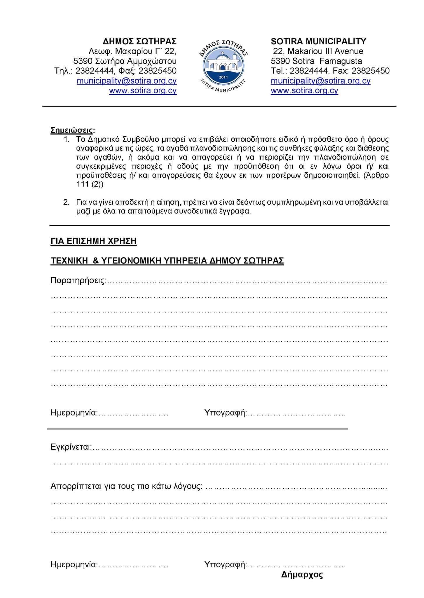 Έντυπα αιτήσεων, οι ενδιαφερόμενοι μπορούν να παραλάβουν από τα γραφεία του Δήμου, στην οδό Μακαρίου Γ΄ 22, 5390 Σωτήρα, στο Δημοτικό Μέγαρο κατά τις εργάσιμες ώρες καθώς επίσης και από την ιστοσελίδα του Δήμου, www.sotira.org.cy