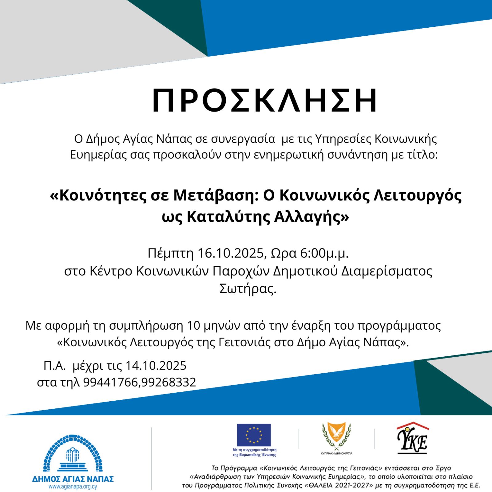 Ο Δήμος Αγίας Νάπας, σε συνεργασία με τις Υπηρεσίες Κοινωνικής Ευημερίας, διοργανώνει ενημερωτική συνάντηση με τίτλο «Κοινότητες σε Μετάβαση: Ο Κοινωνικός Λειτουργός ως Καταλύτης Αλλαγής», την Πέμπτη, 16 Οκτωβρίου 2025 και ώρα 6:00 μ.μ., στο Κέντρο Κοινωνικών Παροχών του Δημοτικού Διαμερίσματος Σωτήρας.