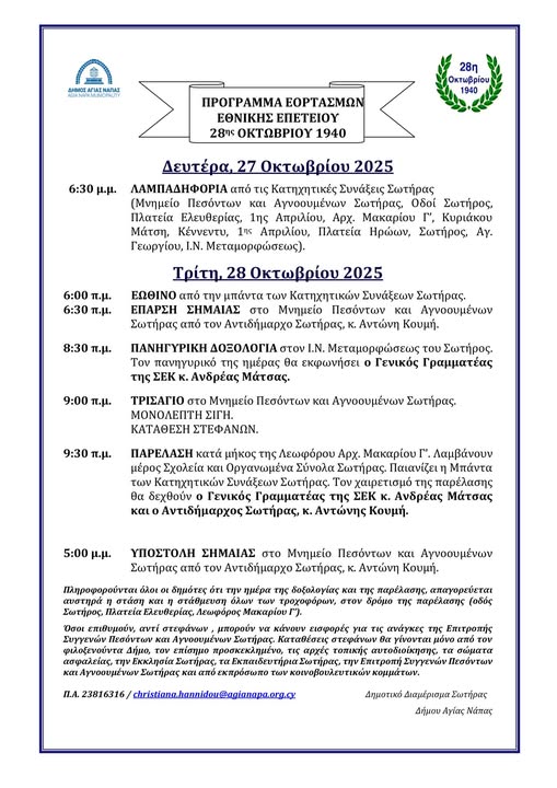 Με κάθε λαμπρότητα το Δημοτικό Διαμέρισμα Σωτήρας του Δήμου Αγίας Νάπας θα τιμήσει την Εθνική Επέτειο της 28ης Οκτωβρίου 1940.